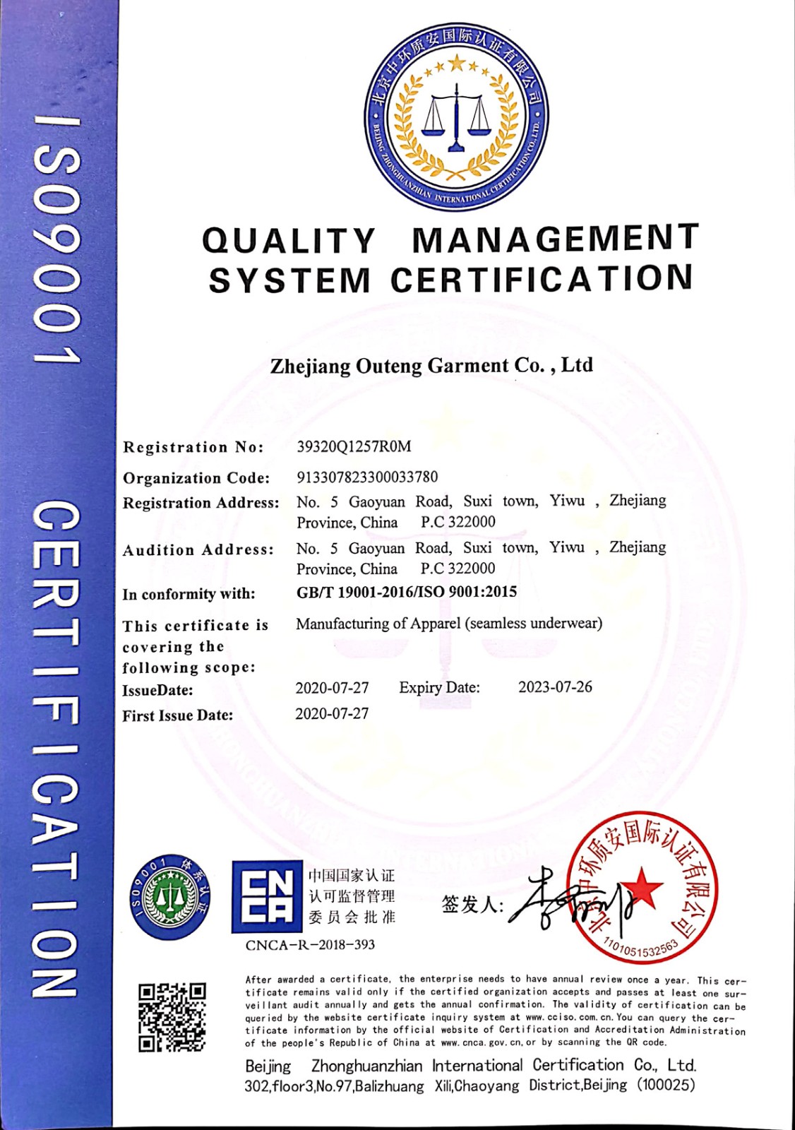 浙江歐騰服飾有限公司位于世界小商品之都-義烏。創立于2015年,是一家專業生產無縫針織運動服飾和內衣的工貿一體企業,擁有自主出口權。 工廠的占地面積約16000平方米 ,引進了大型圣東尼、高騰等多種先進的制衣設備300余臺。月產能可達90萬件。 歐騰服飾每年投入近百萬資金打樣開發新產品,有著一支高素質設計、技術員工隊伍。工廠先后通過了ISO 9001質量管理體系認證、BSCI認證、GRS認證、OEKO-TEX國際生態紡織品認證等多項專利檢測報告。可提供OEM&ODM服務。歐騰服飾以一套完整、科學的質量管理體系,生產的服裝從原材料紗線到成衣,質量完全能夠滿足國內、國際質量要求。獲得了客戶一致好評。工廠先后獲得省科技型企業、國家高新企業、義烏市誠信講信用單位、規上企業、信用AAA級等榮譽。